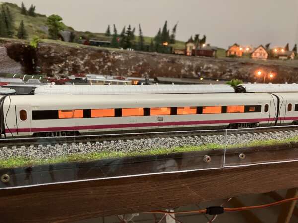In qualche modo riuscii a raddrizzare l’asse piegato ed a reinserire la ruota. E ICE finalmente cominciò a correre senza sobbalzi, fluidamente come mi sarei aspettato da un Fleischmann. Ho avuto molta fortuna con questo acquisto, il guasto poteva essere irrimediabile ma grazie alla totale mancanza di conoscenza tecnica del venditore, sono riuscito ad ottenere a basso prezzo, un ottimo modello. Credo anche che il treno fosse inusato da molto tempo perché le ruote seppure apparentemente pulite, in verità avevano una specie di patina invisibile, che impediva il corretto scorrere della corrente. Con una buona pulizia la captazione della corrente è migliorata notevolmente. Ho anche sostituito gli anelli di attrito che mi sembravano un po’ vecchi. Le luci delle carrozze si illuminano ad intermittenza: credo che l’aggiunta di un condensatore possa risolvere il problema.