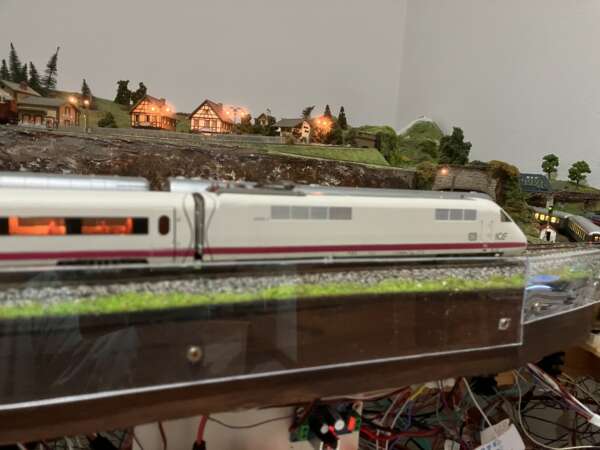 ICE è un ottimo modello, ben fatto e rifinito, non iper dettagliato come detta la tendenza odierna, ma dal funzionamento impeccabile. L’unità motrice posta in una delle due testate del convoglio, è composta da due carrelli da 2 assi. Il motore a 3 poli è collocato sopra uno dei carrelli e con una cascata di ingranaggi trasmette il moto sulle 4 ruote del carrello, tutte dotate di anelli d’attrito. Le luci sono sincronizzate col moto: in avanti si accendono quelle 3 bianche, in senso opposto le due rosse. Le carrozze sono illuminate e con arredamento interno. Ogni carrozza è dotata di ganci NEM 362, quindi si può inserire qualsiasi gancio che rispetti tale norma. Fleischmann però fornisce un gancio particolare, rigido, che come nella realtà tiene molto ravvicinate le carrozze, come fosse un tutt’uno, senza però impedire la percorrenza delle curve più strette, come quelle con 360 mm di raggio.