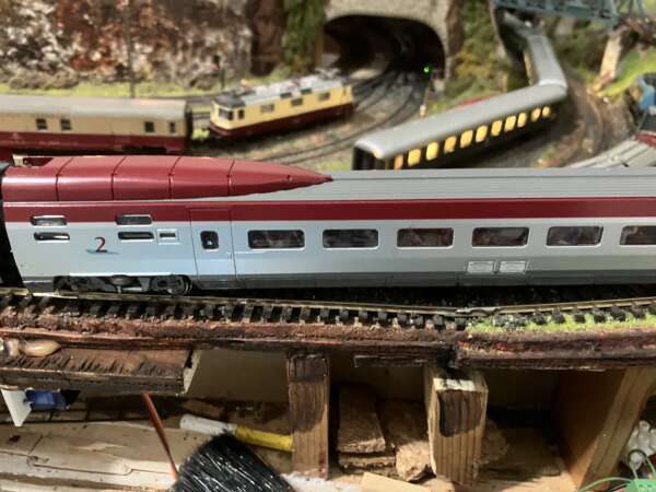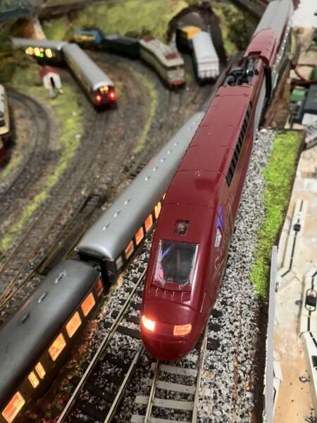 Ho usato un decoder Laisdcc ad 8 pin, che uso per i modelli meno raffinati. Tuttavia devo ammettere che il funzionamento è molto fluido e regolare. Il TGV percorre senza problemi il tracciato, superando facilmente salite abbastanza impegnative e disimpegnandosi agilmente nelle curve: non certo un tracciato per un treno ad alta velocità. Non ha problemi nei deviatoi e neppure nelle curve più strette, circa un R2 di diametro. Le ruote contribuiscono in maniera determinate alla rumorosità mentre il motore neppure si percepisce. Solo alle alte (molto alte) velocità compaiono dei deragliamenti, ma solo in alcuni deviatoi, che forse appesantendo un po’ le carrozze, potrebbero sparire. Ho trovato solo un vero difetto: nelle salite il TGV sale tranquillamente solamente con la motrice in tiro, ovvero quando posta davanti al convoglio. In fase di spinta perde molto in trazione, slittando vistosamente. Nonostante questo difetto, il TGV si comporta come un molto bene.