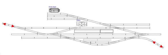 Nello schema in esempio da una linea principale a binario semplice, se ne distacca una secondaria. La stazione è dotata di scalo merci, di binario di precedenza e di aste di manovra. Gli angoli dei deviatoi sono di 15°.